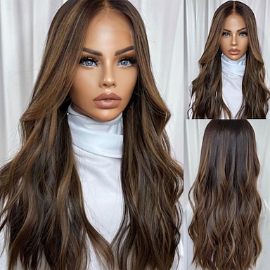 Peruca de cabelo humano virgem brasileiro não processado, ondulado, com fecho de renda 5x5 sem cola, mechas loiras com reflexos castanhos, peruca frontal de renda 13x4 com baby hair.