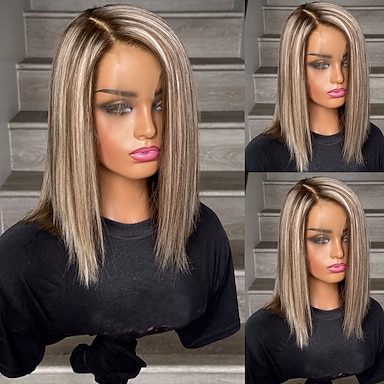 Peruca curta bob de cabelo humano com fecho 5x5, lace frontal 13x4, repartição livre, cabelo brasileiro liso loiro acinzentado ombré, peruca de cabelo humano com baby hair, linha capilar natural, 100%