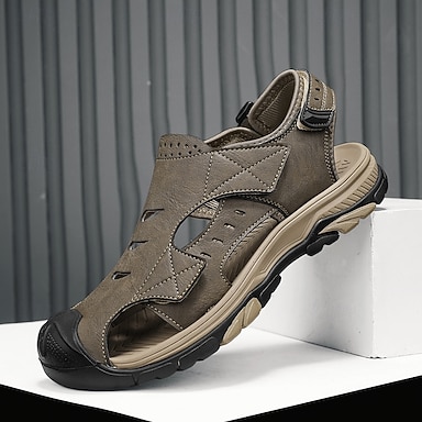 Sandálias masculinas cáqui para atividades ao ar livre, com biqueira fechada, sistema de ajuste regulável, modelo leve e confortável para caminhadas, camping e uso diário.