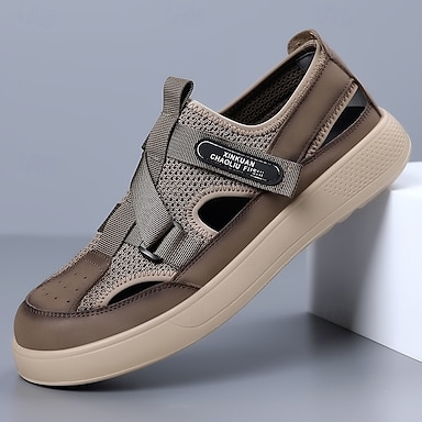Sandálias masculinas marrons fechadas para caminhadas ao ar livre com cabedal em malha respirável e sola acolchoada, estilo aventura para adultos, adequadas para trilhas de montanha, caminhadas na floresta e acampamentos de verão