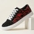 Tênis casual masculino preto e vermelho com estampa gráfica, cadarço, leve e confortável para caminhada, calçado moderno de cano baixo para uso diário, viagens, looks urbanos, fins de semana e estilo casual.
