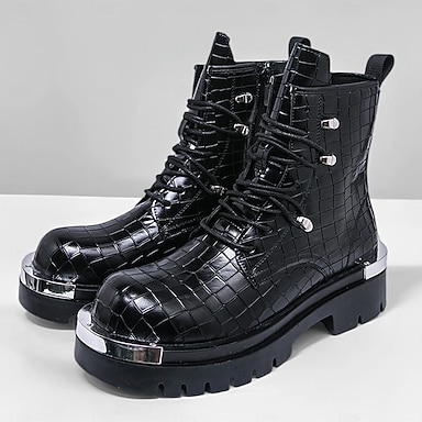 Botas masculinas pretas com estampa de crocodilo, cadarço, sola grossa e detalhes metálicos – estilosas para motociclistas, moda urbana, uso casual e estilo rock