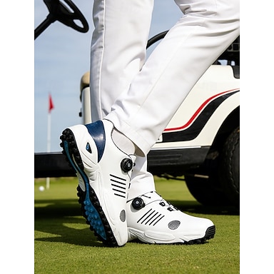 Sapatos de golfe masculinos brancos, cabedal respirável com sistema de ajuste regulável, sola acolchoada e aderente, estilo esportivo moderno para campos de golfe.