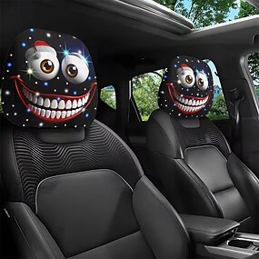 Conjunto de 2 capas para encosto de cabeça de carro com estampa de rosto de desenho animado de olhos grandes, decoração interna, tamanho universal, laváveis, fáceis de instalar, ideais para viagens