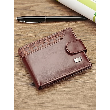 Carteira masculina em couro sintético com detalhes em relevo de crocodilo, vários compartimentos para cartões, carteira dobrável preta e marrom para uso diário, viagens a trabalho e lazer.
