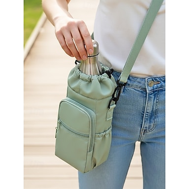 Bolsa impermeável feminina em nylon para garrafa de água com bolso para celular, bolsa transversal multicolorida para fitness, esportes, caminhadas e uso casual, alça de ombro ajustável e porta-bebidas para viagem.