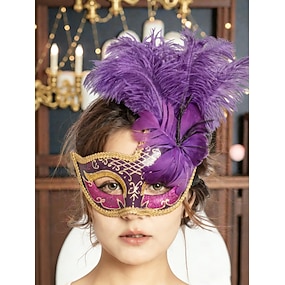 Máscara de Mardi Gras com penas roxas para mulheres - Máscara de meia veneziana com glitter e detalhes em dourado para carnaval bailes de fantasia e eventos de festa glamourosos