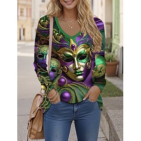 Camiseta Feminina de Carnaval de Manga Longa Tee Gráfica Casual de Manga Longa Gola V Regular Tops Diários Impressão Recortada Roxa Verde Primavera Outono Pré-Outono