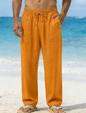 Homens calções capri Calças de linho Calça verão Cintura elástica Perna reta Tecido Conforto Respirável Comprimento total Casual Diário Ao ar livre Moda Simples Abóbora Branco Sem Elasticidade