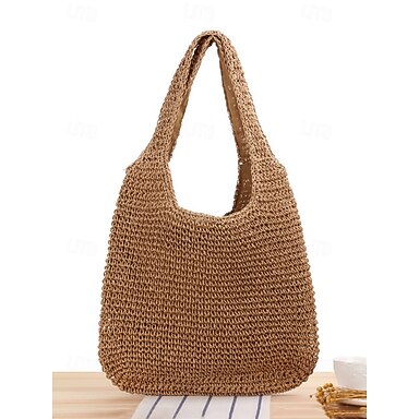 bolsa de ombro feminina feita à mão em palha trançada – grande bolsa de praia boho para viagens de verão, férias e roupas casuais marrom bege