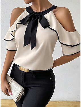 Mulheres Blusa Patchwork Ilhó Botões Tecido à moda Moderno Casual Manga Curta Decote V Tops regulares Diário Feriado Para Noite Azul Preto Rosa Verde Verão Primavera