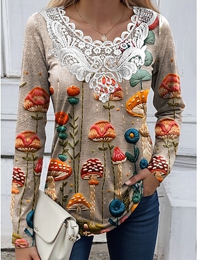Blusa Feminina Tunica Renda Splicing Gola V Manga Longa Floral Grafismo Plantas Vintage Gola Redonda Tops Diaria Saindo Fim de Semana Print Renda Patchwork Preto Vermelho Azul Céu Azul Antigo Verde