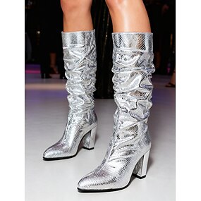 botas femininas de cano alto, prateadas e metálicas – botas de salto bloco com estampa de cobra brilhante para moda de festa, clube e festival