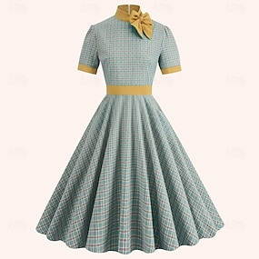 Retro Vintage Anos 50 Hepburn Meio-dia Vestidos Vestido swing Vestido Flare Xadrez Guingão Fantasia Mulheres Baile de Máscaras Mascarilha Encontro Festa de Solteira Adulto Vestido Vestidos de baile