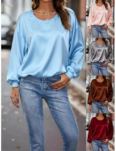 Blusa feminina de cetim, cor lisa, elegante e estilosa, básica, manga longa, gola redonda, tops regulares para uso diário, nas cores azul, rosa, vinho, marrom e cinza, para primavera e outono.