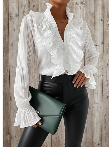 Mulheres Camisa Social Blusa Frufru Côr Sólida à moda Básico Manga Longa Decote V Tops regulares Diário Feriado Para Noite Branco Verão Primavera