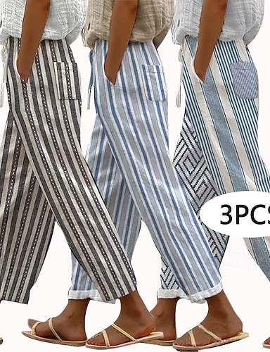 Conjunto com 3 peças de calças femininas de linho sintético, algodão e linho, para o verão, casuais, básicas, para férias e uso diário. Comprimento até o tornozelo, com listras naturais, cordão na cintura, bolsos laterais, confortáveis, respiráveis e sem