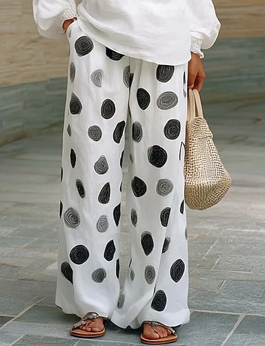 Mulheres Linho de algodão sintético Perna larga Calça verão Férias Básico Casual Comprimento total Cintura Alta Poá Bolsos Cintura elástica Imprimir Confortável Conforto Macio Com Stretch Ao ar livre