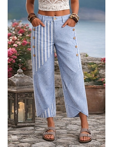 Mulheres chinês Reto Férias Moda Roupa de rua Comprimento total Cintura Alta Listrado Bolsos Confortável Macio Respirável Micro-Elástica Ao ar livre Férias Rua Azul Verde Militar Preto Rosa Verão