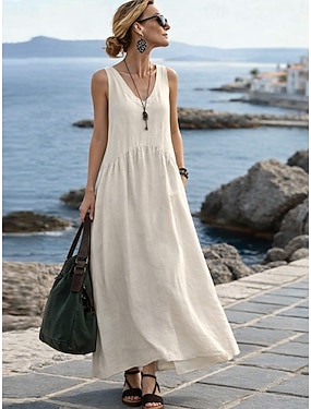 Mulheres Vestido Longo Linho de algodão sintético Vestido A Line Casual Diário Ajuste Largo Tecido Sem Manga Decote V Preto Amarelo Vinho Verde Tropa Verão Primavera Outono
