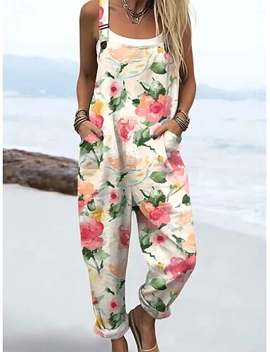 Womens Dungarees 100% Algodão Ativo Floral Sem Mangas Reto Decote Quadrado Com Bolso Férias Diário Ajuste Solto Branco Rosa Verde Verão