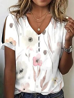 Camiseta Boho Feminina Semelhante Ao Algodão Linho T-Shirt Floral Gráficos Plantas Vintage Estilosa Clássica Manga Curta Gola V Tops Regulares Diário Fim de Semana Férias Estampada Branco Rosa