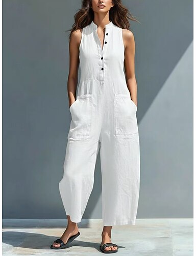 Macacão feminino de linho sintético, cor sólida, sem mangas, pernas largas, decote em V, bolso, botões, para uso diário, férias, modelagem regular, nas cores azul, preto e branco, ideal para o verão.