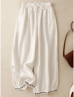 Mulheres Calça verão 100% Algodão Calças Férias Básico Casual Diário Comprimento total Natural Tecido Com Cordão Renda Respirabilidade Confortável Respirável Sem Elasticidade Para Noite Final de