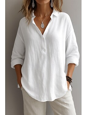 Blusa Feminina de Linho Sintético como Algodão com Botões Cor Sólida Elegante Diária Estilosa Manga Longa Gola de Camisa Tops Longos Diários para Sair Preto Branco Vinho Azul Marinho Azul Céu