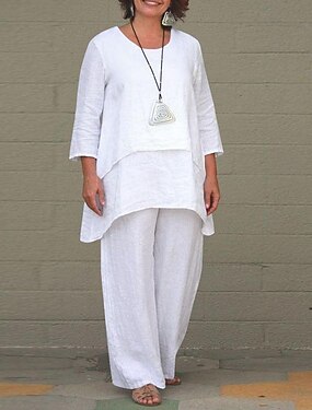 Mulheres Camisa Social Camisas de algodão e linho jogo de linho Conjunto 2 Peças Côr Sólida Moda Casual Decote Redondo Diário Rua Azul Branco Cáqui Cinzento Verão Primavera Outono Primavera & Outono