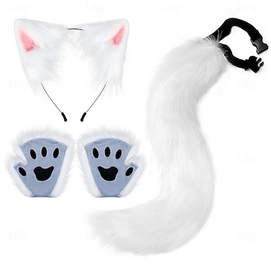 conjunto de faixa de cabeça com rabo de gato peludo e orelhas de animal – rabo de raposa &orelhas de gato para cosplay de Halloween, fantasia de anime, festa e apresentação de palco
