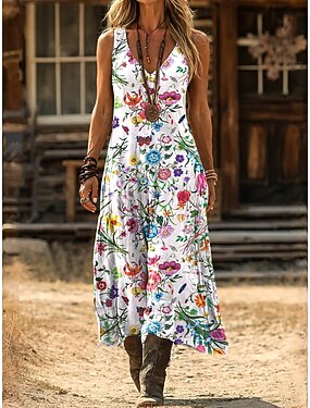 Mulheres Vestido Longo Vestido Boho Vestido antigo Vestido casual Vintage Normal Boho Floral Sem Manga Decote V Branco Rosa Castanho Claro Verão Primavera