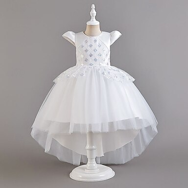 Vestido para Meninas das Flores Crianças Para Meninas Vestido de princesa Espetáculo Casamento Festa Elegante Lindo Com Transparência Côr Sólida Manga Curta Gola Redonda Branco Champanhe 4 anos +