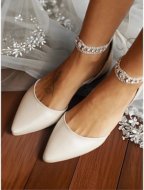 Sapatilhas de noiva femininas cor marfim com tira de strass no tornozelo – elegantes sapatos de casamento de bico fino para noivas.