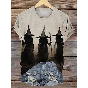 Camiseta Feminina de Halloween Estampa de Bruxa Gráfico Vintage Estilo Casual Manga Curta Gola Careca Tops Regulares Impressão Diária Preto e Cinza Caqui Cinza Claro Cinza Escuro Verão Primavera