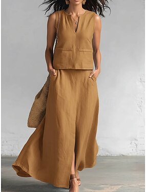 Mulheres Conjuntos de calças Linho de algodão sintético Sem Manga Decote V Côr Sólida Elegante Moda Roupa de rua Casual Diário Ao ar livre Azul Preto Camelo Verão Normal