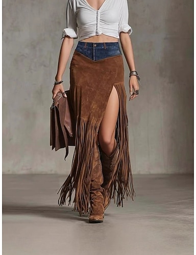Mulheres Saia de camurça sintética Boêmia Vintage Longo Cintura Média Saias Castanho Claro Primavera Camurça