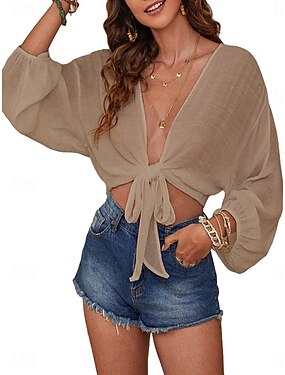 Mulheres Camisa Social Blusa gravata na frente Patchwork Tecido Ativo Férias Vintage Manga Longa Decote V Tops regulares Diário Praia Feriado Preto Branco Laranja Cáqui Verão Primavera