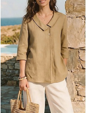 Mulheres Camisa Social Camisas de algodão e linho Botão para cima Blusa Botões Côr Sólida Básico Casual Manga 3/4 Decote V Tops regulares Diário Preto Branco Vermelho Cáqui Verão