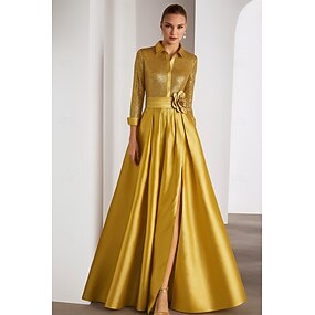 Linha A Longo Camisetão Vestido formal Vestido de noite Manga Longa Colarinho de Camisa Elegante Formal Convidado do casamento Cetim Vestido Para Mãe dos Noivos com Purpurina Pregas
