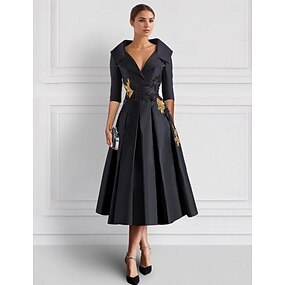 Vestidos de coquetel A-Line Bordados Vestido Smoking Mãe da Noiva Elegante Formal Comprimento do Tornozelo Manga 3/4 Gola de Camisa Bolso Cetim com Apliques