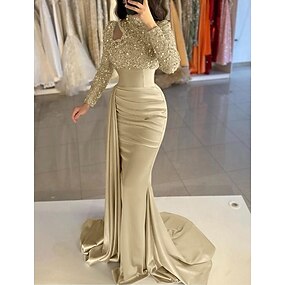 Vestido de Noite Sereia Lantejoula Vestido Elegante Formal Cauda  Penteado Manga Longa Decote Alto Cetim com Pérolas Vestido de Máscara