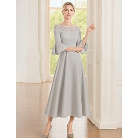 Linha A Até o Tornozelo Vestido de festa Vestido Coquetel Manga 3/4 Gola Redonda Elegante Formal Renda Poliéster Vestido Para Mãe dos Noivos com Renda