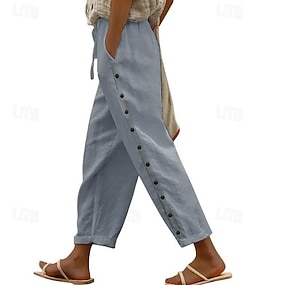 Calça feminina 100% algodão, ideal para o verão, casual, para uso diário, comprimento até o tornozelo, lisa, com bolsos laterais, respirável, confortável e sem elasticidade, perfeita para o fim de semana. Disponível nas cores azul, preta, branca e cáqui.