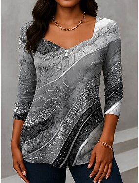 Mulheres Camiseta Blusa Imprimir Listrado Casual Manga 3/4 Decote V Tops regulares Diário Azul Marinha Cinzento Primavera Verão