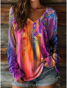 Mulheres Blusa Imprimir Tintura Tie Dye Flor Boêmia Diário Manga Longa Decote V Tops regulares Diário Feriado Azul Rosa Roxo Fúcsia Damasco Verão Primavera Outono