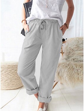 Mulheres Linho de algodão sintético Calça casual Calça verão Reto Férias Básico Casual Comprimento total Cintura Alta Côr Sólida Tecido Bolsos Cintura elástica Confortável Macio Respirável Com Stretch