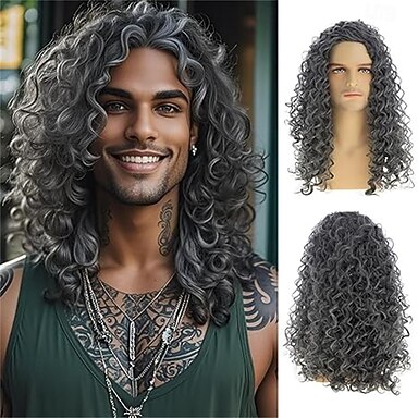 Peruca sintética encaracolada com risca ao meio, comprimento médio, cinza, para homens, moderna, macia e com aparência natural.
