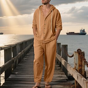 Homens Camisa de linho Ternos-Camiseta Roupas de 2 peças Camiseta e Shorts Manga Longa Com Capuz Verão Primavera Tecido Moda Casual 2 Peças Botão para baixo Férias Roupa Diária Para Noite Preto