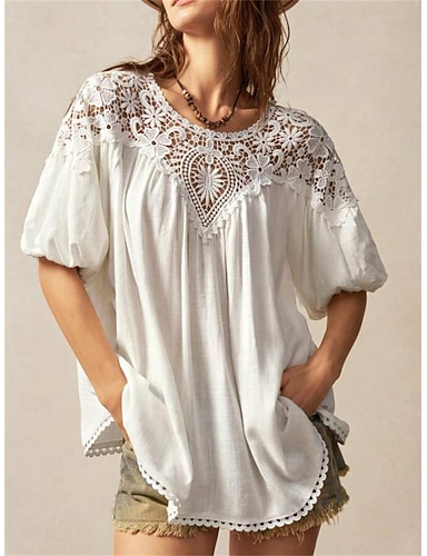 Mulheres Tops de verão Blusa Tops de renda Franzido Renda Patchwork Tecido Elegante Tropical senhoras Manga Curta Manga lanterna Gola Redonda Tops regulares Diário Trabalho Feriado Branco Amarelo